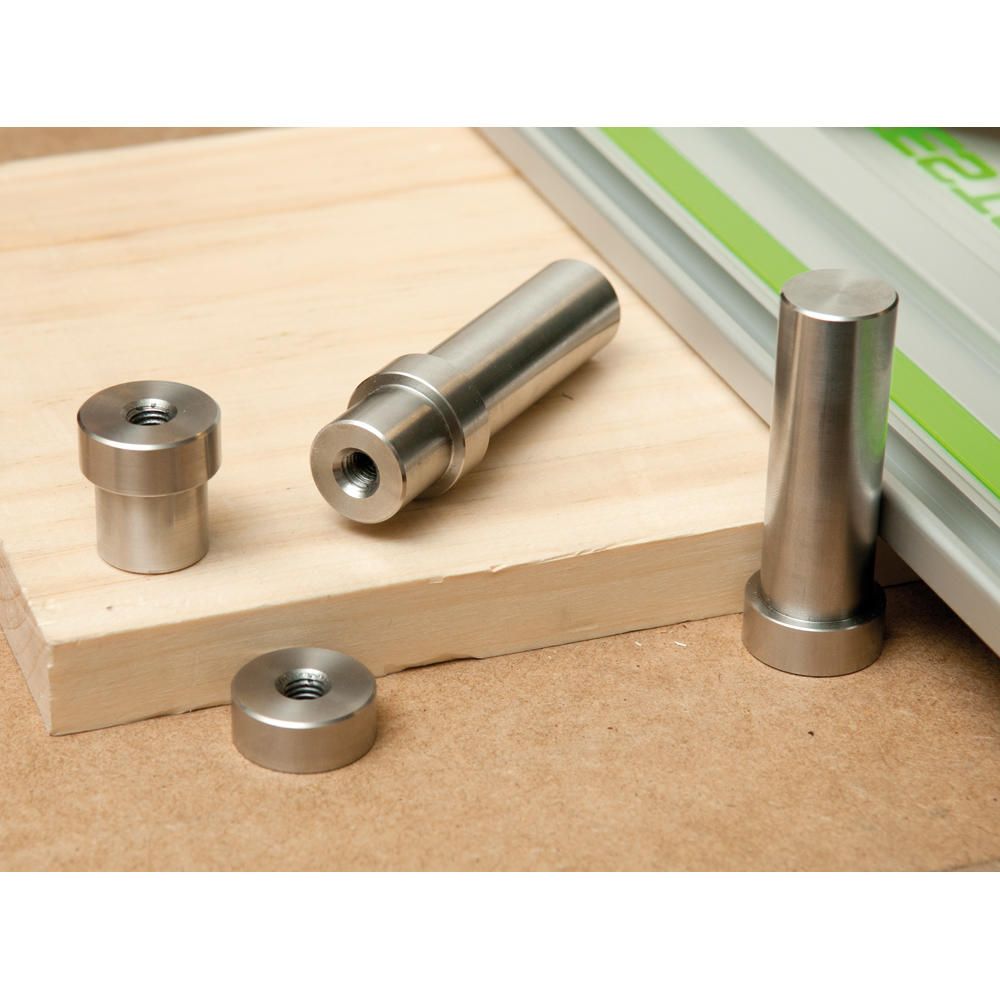 Ktoś powie można zamocować kawałek prostokątnej formatki. Można tylko trochę trudne jest równolegle do szyny  i w odległość zgodnie z wymiarem i nie przesunąć/przestawić przy dociskaniu do blatu . Oczywiście w tym kawałku  można wyfrezować dwa "rowki " równoległe do siebie w odległości otworów , a prostopadłe (rowki) do szyny. Mam takie stopery ale ostatnio nie używam bo za duża precyzyjnego ustawiani.